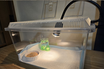 当園では、うずらフードをあげています。副食として、 青菜類などの野菜やミルワームなど もあげています。